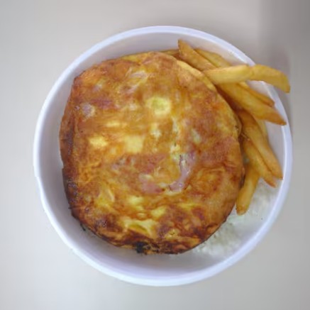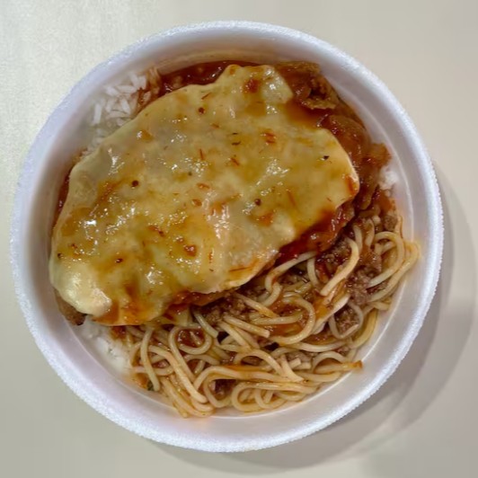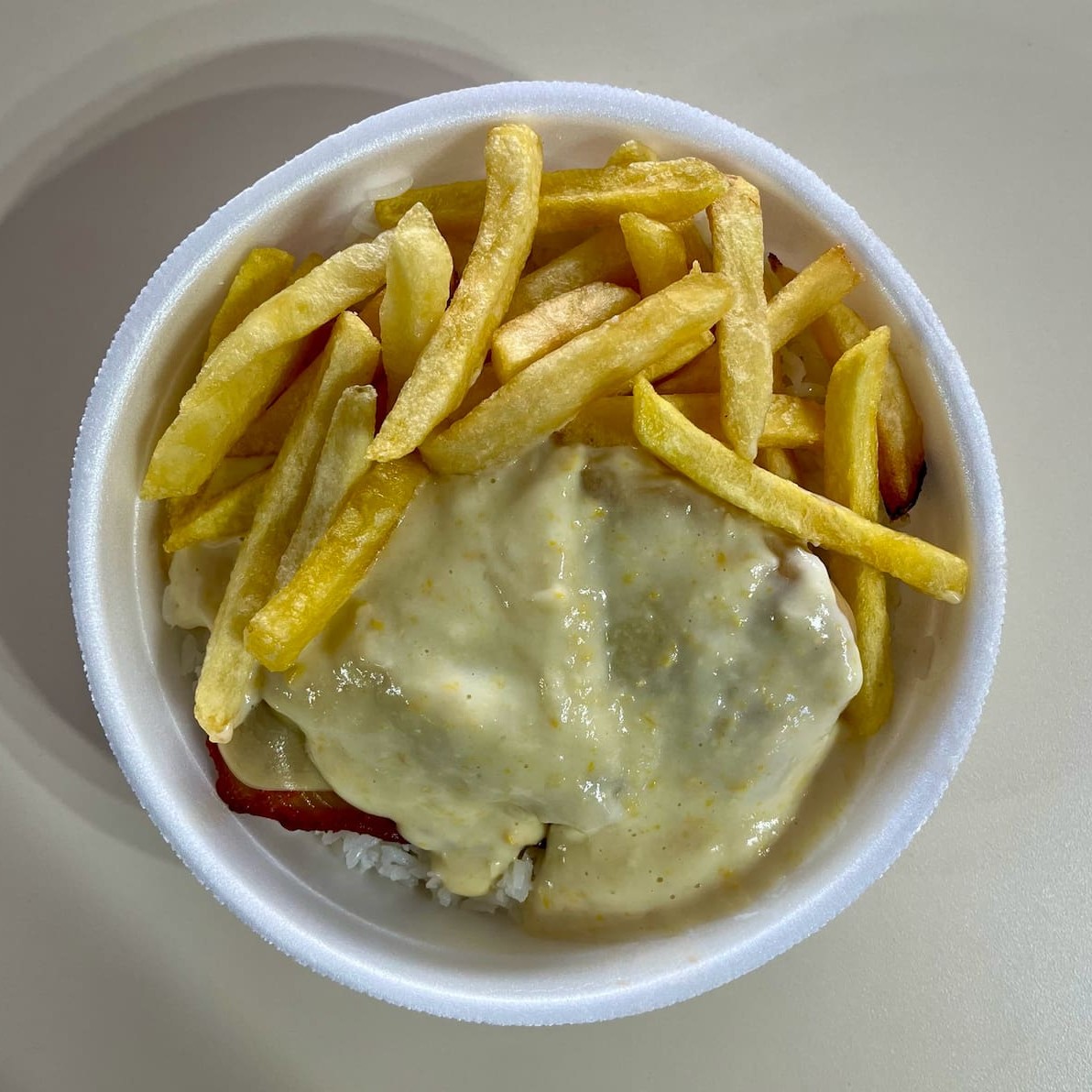 (Frango Milanesa, Mussarela, Tomate e Orégano) Arroz e Fritas