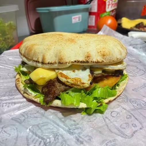 Pão Sírio, Contra Filé, Maionese da Casa, Alface, Tomate, Queijo Prato, Ovo e Bacon + Batata Frita (Imagem Ilustrativa)