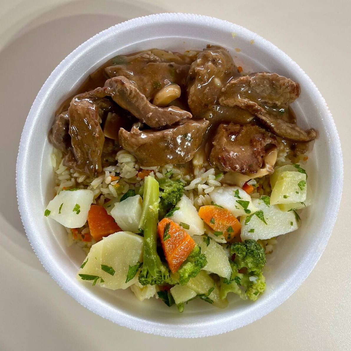 (Isca de Carne, Molho Madeira e Champignon) Arroz e Legumes