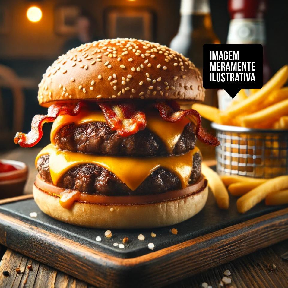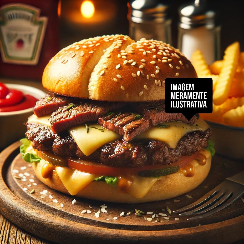 Pão Brioche, Picanha Fatiada, Alface, Maionese da Casa, Bacon, Queijo Prato e Catupiry + Batata Frita (Imagem Ilustrativa)