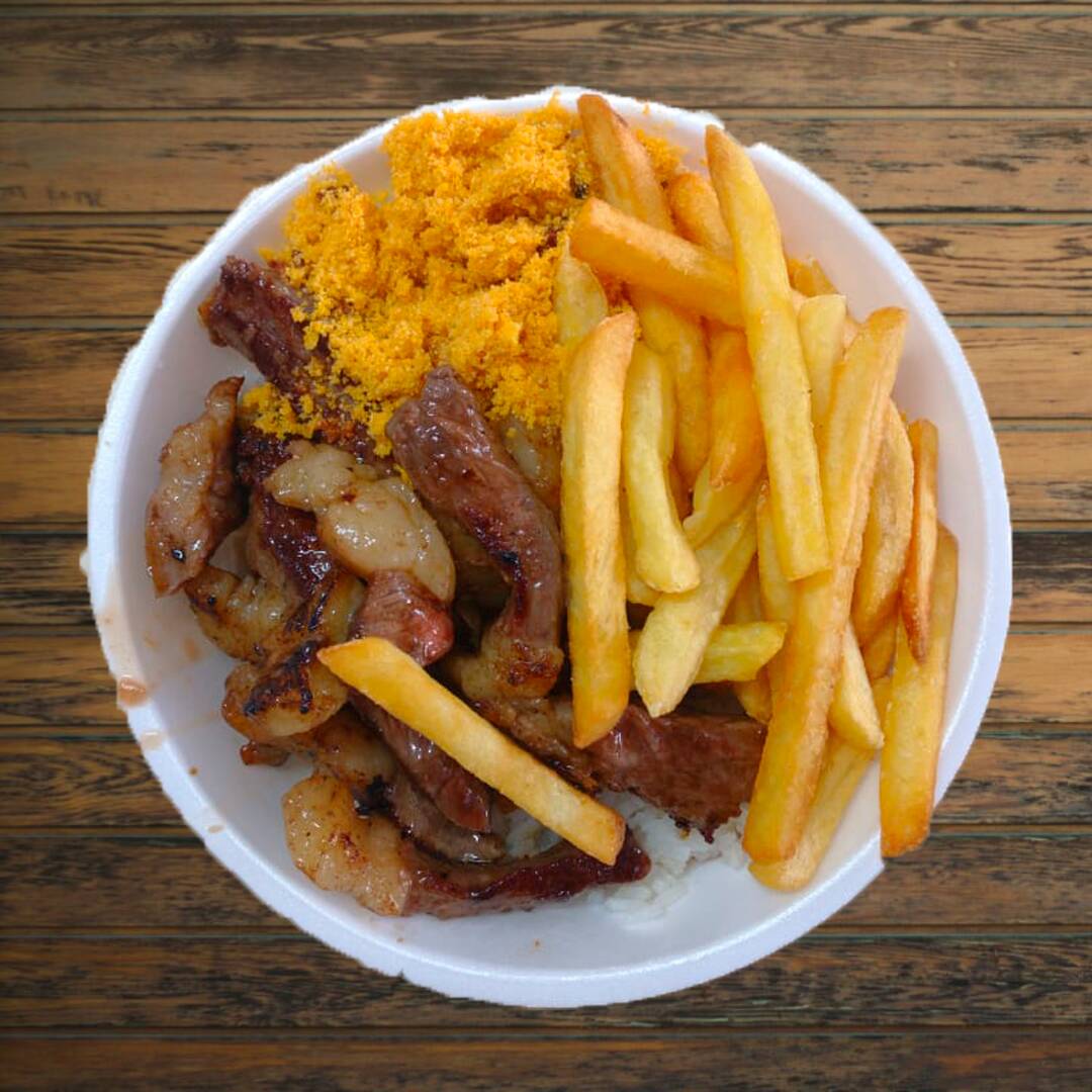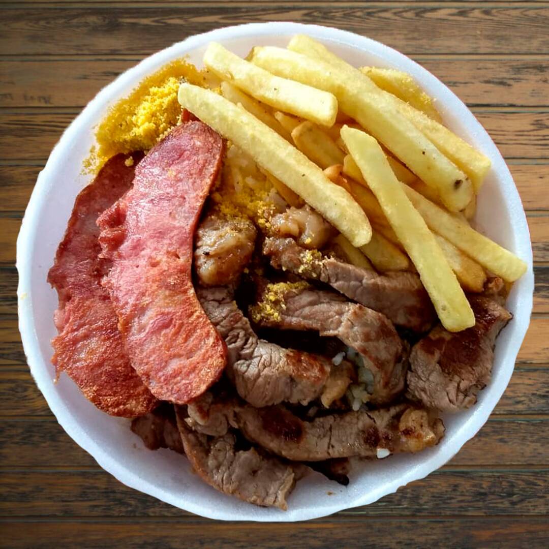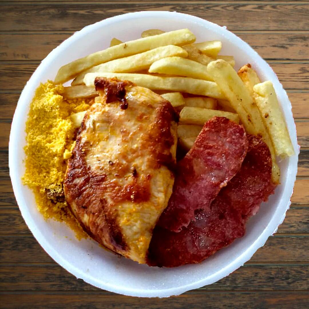 Frango, calabresa, contra filé fatiado, arroz, feijão, fritas e farofa.