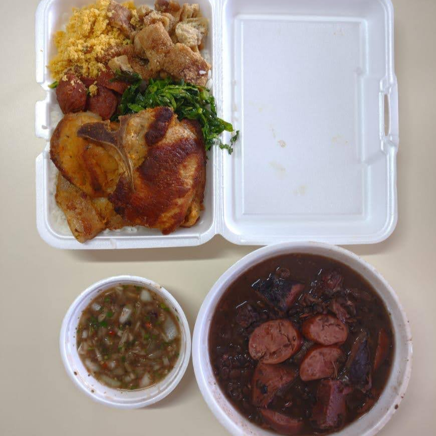 Arroz, Couve, Bisteca, Linguiça, Farofa e Torresmo (refrigerante de brinde)