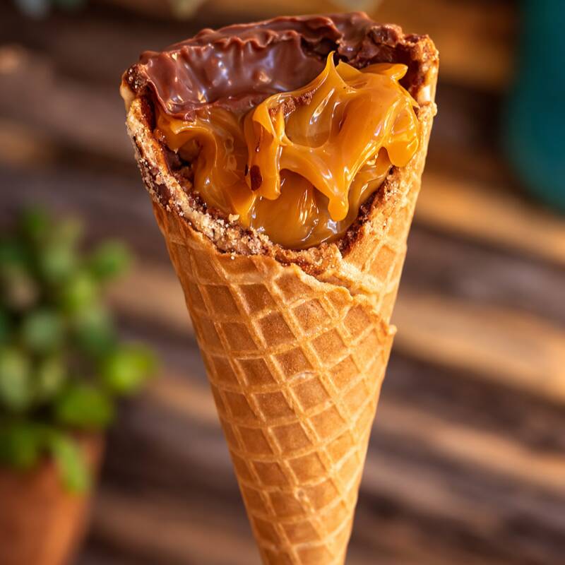 Irresistível casquinha crocante banhada no chocolate ao leite e rechado com um delicioso doce de leite.