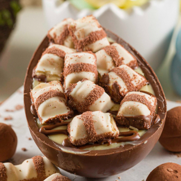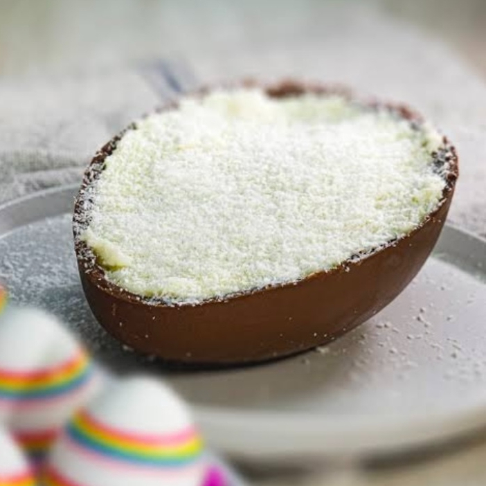 Casca de chocolate ao leite com recheio de ganache de chocolate e finalizado com coco ralado.