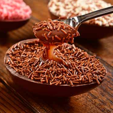 Casca de chocolate ao leite com recheiro de brigadeiro cremoso e finalizado com granulado.