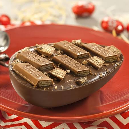 Casca de chocolate ao leite com recheiro de ganache de chocolate e finalizado com Kit Kat.