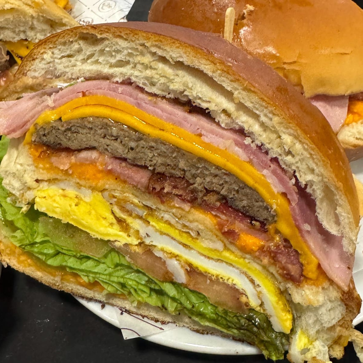 Pão de hambúrguer carne bacon calabresa presunto queijo prato ovo maionese