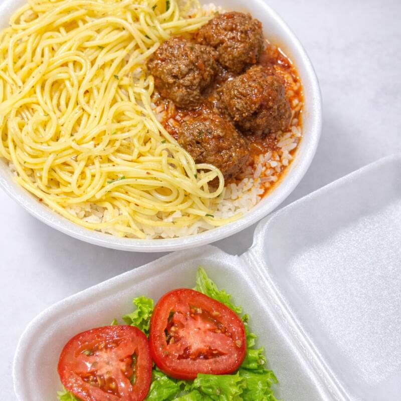 Almôndegas carne moída arroz feijão macarrão salada