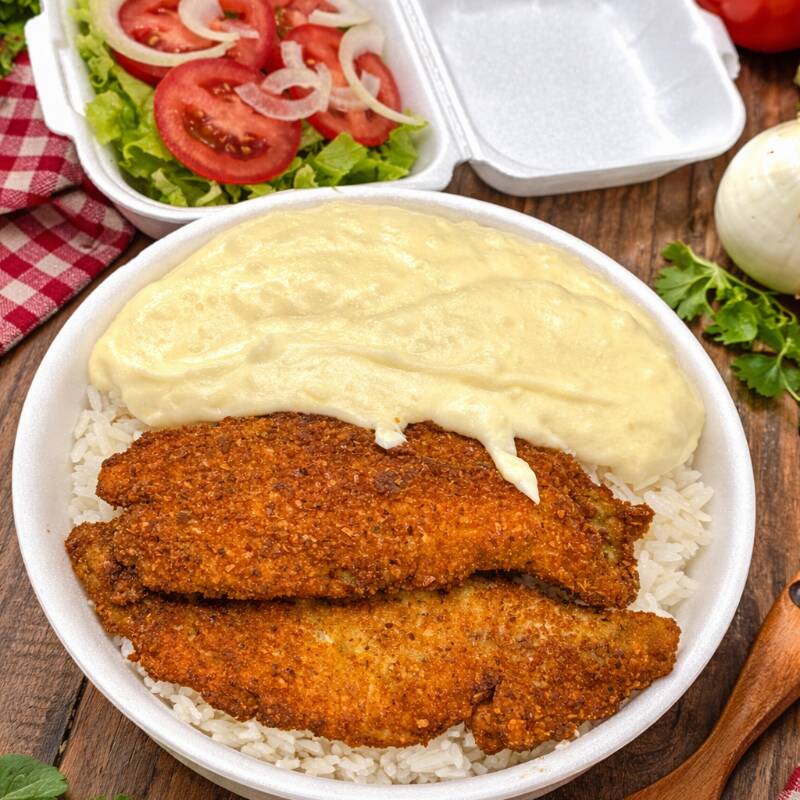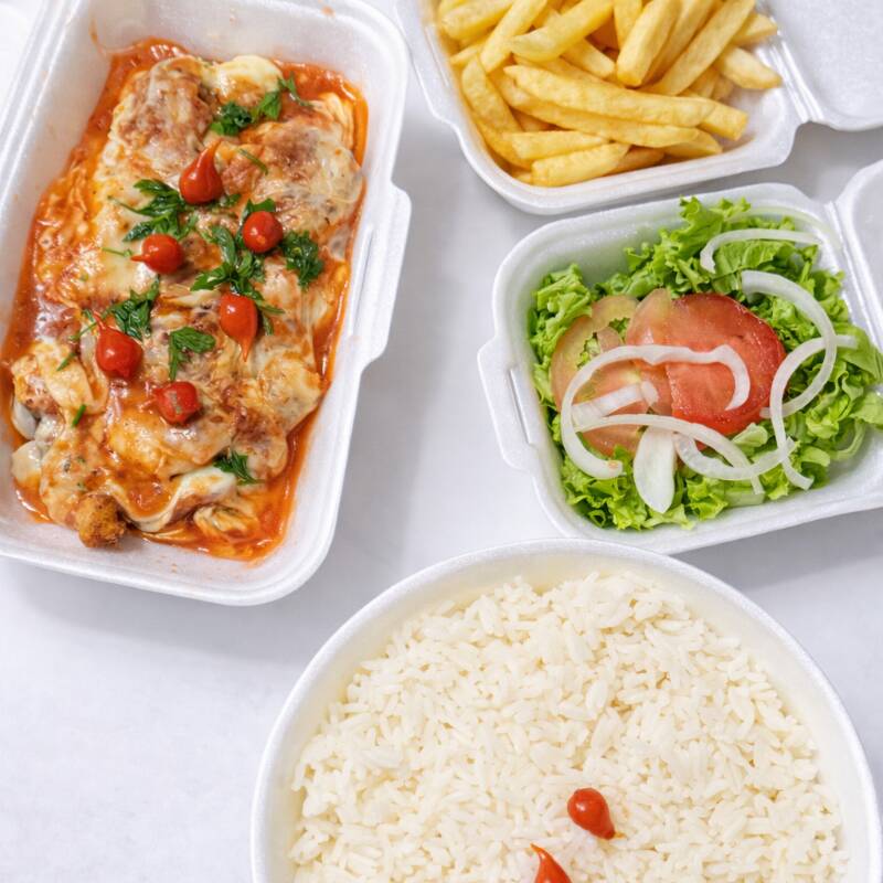 Arroz frango à parmegiana, salada fritas