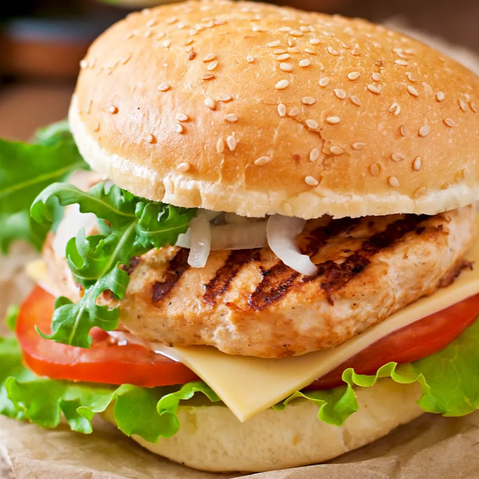 Pão de hambúrguer filé de frango grelhado queijo prato salada