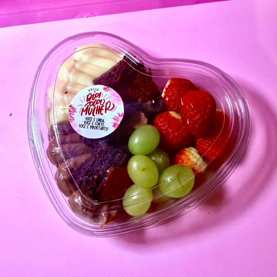 Petisqueira doce em formato de coração com morangos, uvas, brownie, creme de chocolate ao leite e creme de ninho. Perfeita para presentear e adoçar momentos especiais.
