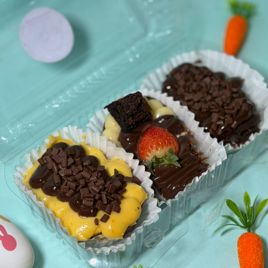 Delicioso trio composto por: ✨ Casca chocolate ao leite de maracujá trufado ✨ Casca de brigadeiro ao leite ✨ Casca dupla com brigadeiro ao leite, brigadeiro de ninho, brownie e morango.