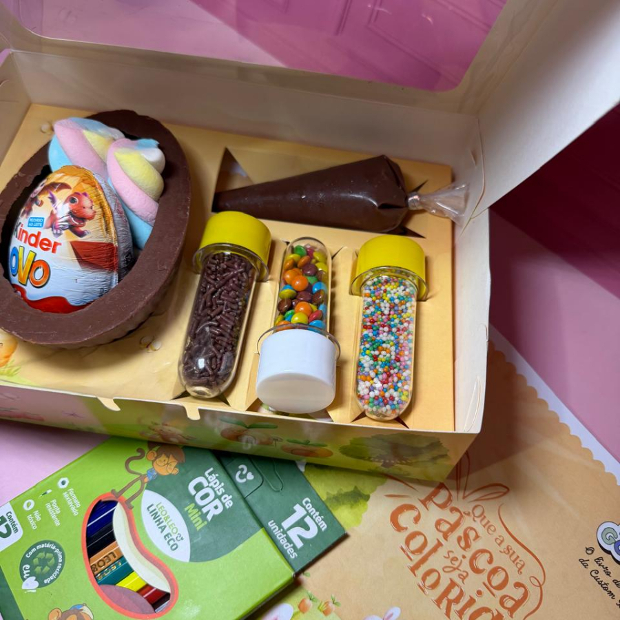 🐰✨ Kit Confeiteiro Infantil ✨🐰 Metade de ovo de chocolate ao leite recheado com marshmallows coloridos + 1 Kinder Ovo surpresa. Acompanha: 🍫 Saco de ganache para decorar 🍬 Tubete com confeitos coloridos 🍫 Tubete com granulado de chocolate 🍭 Tubete com mini chocolates 📖 Livrinho de colorir 🖍️ Caixa de lápis com 12 cores Perfeito para a criança montar, decorar e ainda se divertir colorindo! 🎨