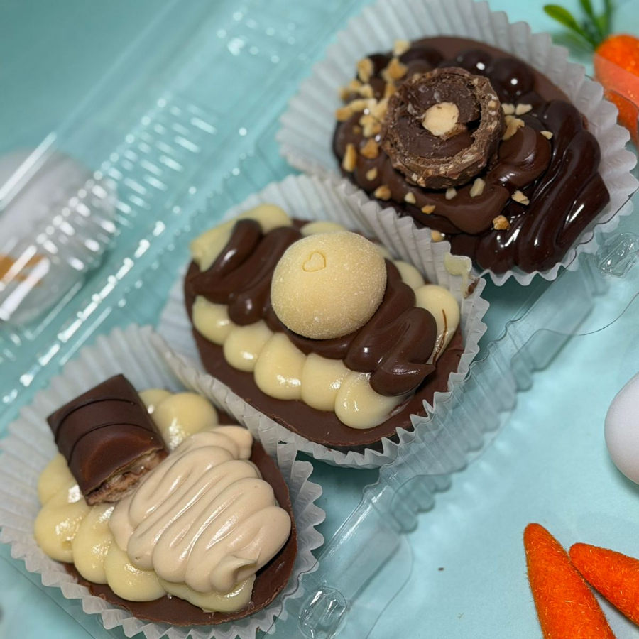 Trio Degustação Premium cascas de chocolate ao leite. A combinação perfeita para quem ama variedade! Ninho com Nutella – creme de Ninho super cremoso com generosa camada de Nutella. Ferrero – chocolate intenso com creme aveludado e toque crocante. Kinder – chocolate ao leite com recheio cremoso que derrete na boca.
