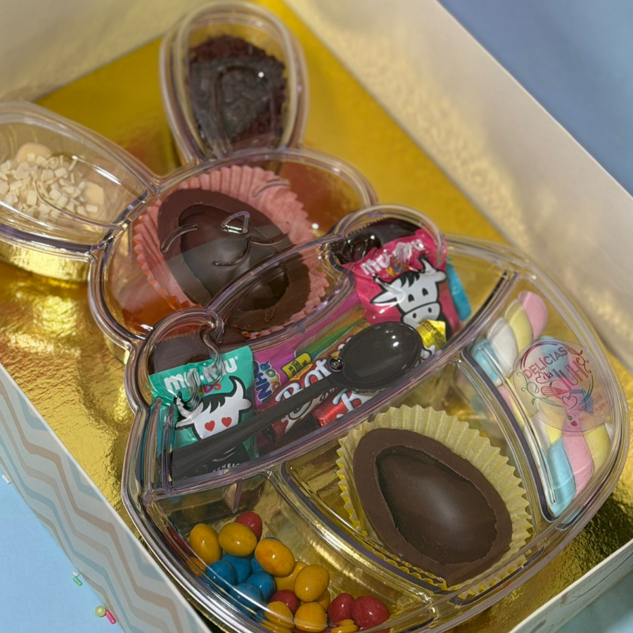 Petisqueira Coelhinho Doce 🐰🍫 Uma petisqueira divertida em formato de coelhinho, perfeita para servir e presentear! Possui divisórias individuais com tampa transparente, ideal para organizar diferentes doces com charme e praticidade. Acompanha mix delicioso com: * Ovinhos de chocolate * Confetes coloridos * Granulado e confeitos * Marshmallows •Chocolates variados Perfeita para Páscoa, festas infantis ou para adoçar qualquer momento especial. 💛✨ [16:51, 25/02/2026] Juliana: Copo Coelhinho de Páscoa 🐰🎨🍫 Copo personalizado com estampa de coelhinho, recheado com ovo de chocolate embalado e finalizado com laço decorativo. Acompanha 1 caixinha de giz de cera para a criançada se divertir pintando. Uma opção criativa e deliciosa para presentear nesta Páscoa! 💛✨