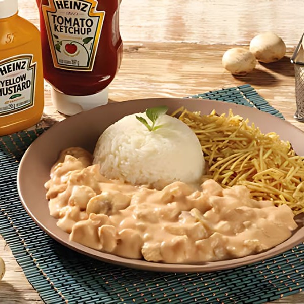 Delicioso strogonoff com cubos de frango suculentos e temperadinhos, molho especial da casa e finalizado com batata palha crocante e arroz fresquinho.
