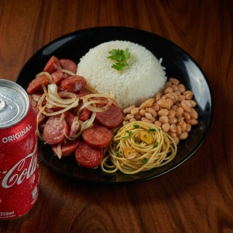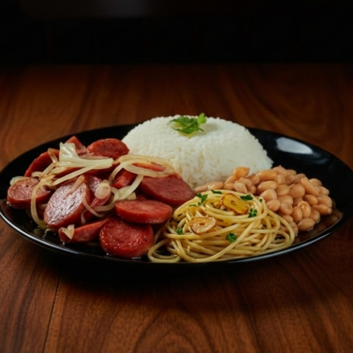 Calabresa acebolada com linguiça crocante e cebolas douradas, servida com arroz, feijão e finalizada com macarrão e farofa. Sabor marcante e irresistível.