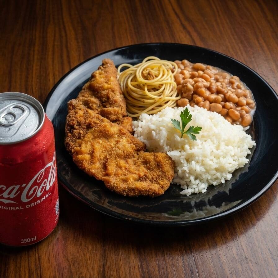 Bife à milanesa crocante e saboroso, acompanhado de arroz, feijão, macarrão alho e óleo e farofa. Prato clássico, bem servido, com Coca-Cola grátis para completar.