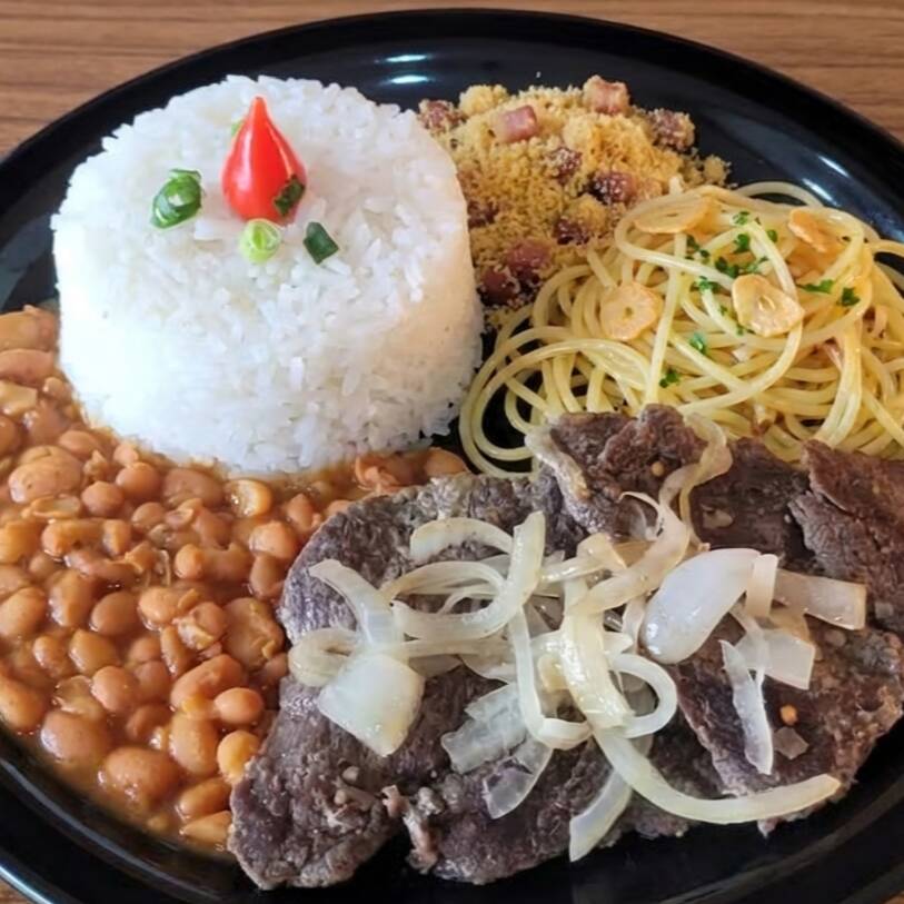 Bife acebolado macio e saboroso, servido com arroz, feijão, macarrão alho e óleo e farofa. Refeição robusta, caseira e cheia de sabor que agrada a todos.