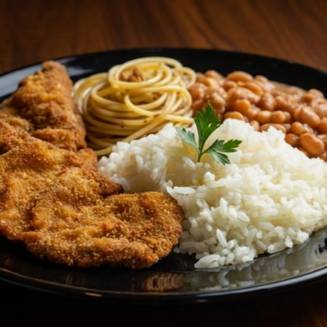 Bife empanado e crocante, acompanhado de arroz, feijão, macarrão alho e óleo e farofa. Um clássico reconfortante, bem servido e com aquele gostinho de comida de casa.