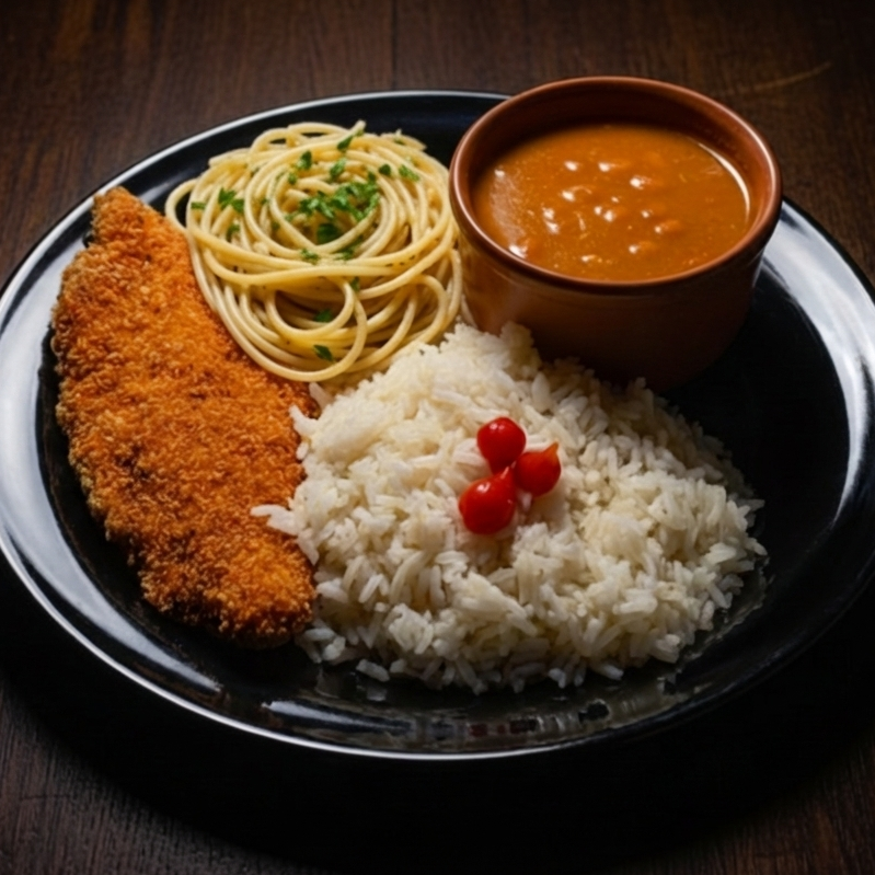 Bife à milanesa crocante e suculento, acompanhado de arroz, feijão e finalizado com macarrão alho e óleo e farofa. Uma opção completa, saborosa e perfeita para qualquer momento.