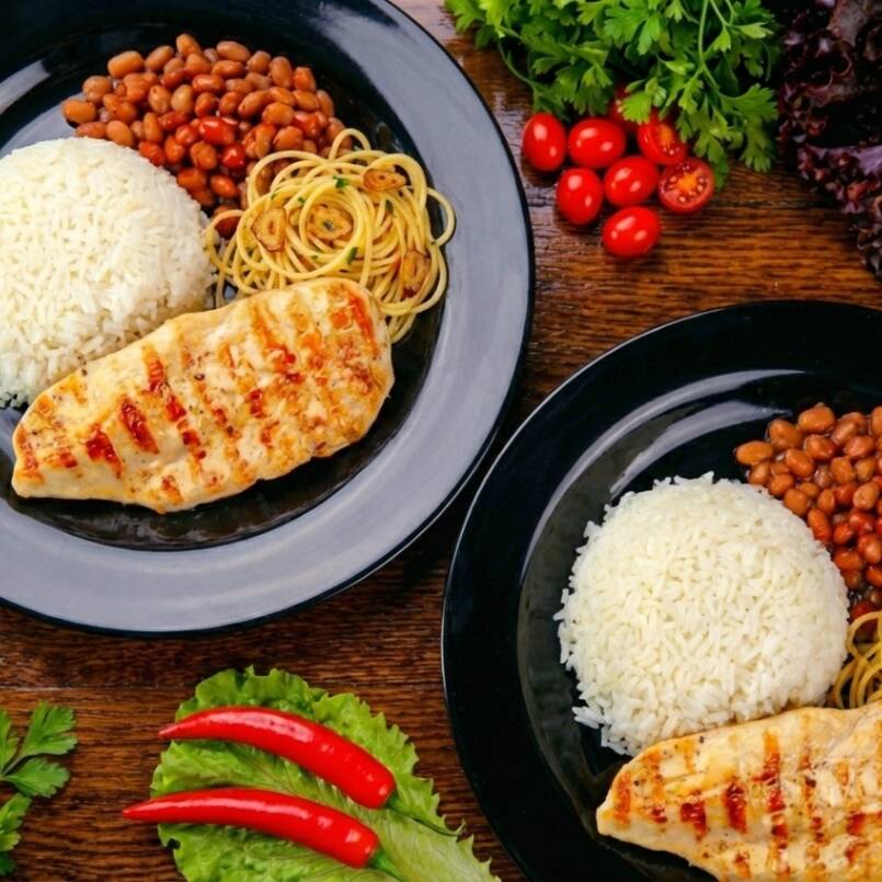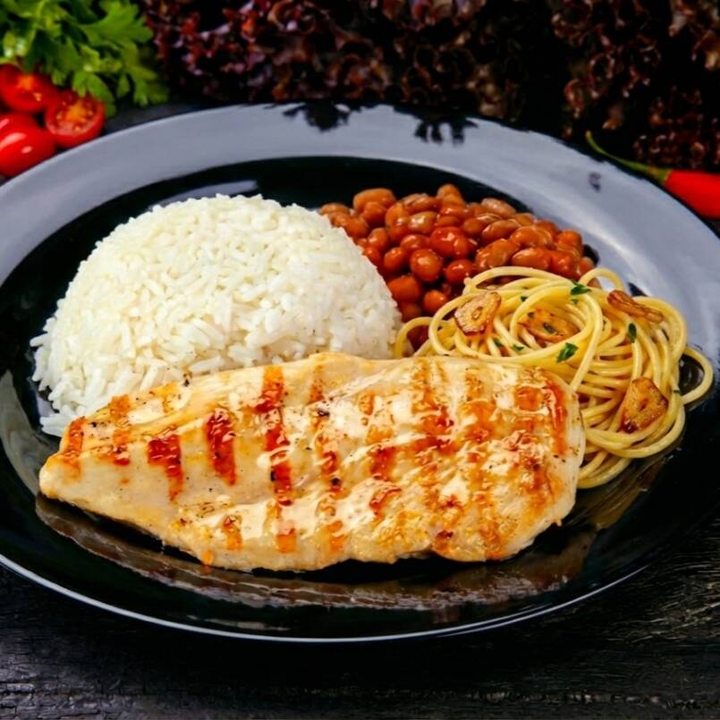 Filé de frango grelhado e temperado na medida, servido com arroz, feijão, macarrão alho e óleo e farofa. Uma refeição leve, completa e cheia de sabor caseiro que mata sua fome com qualidade.