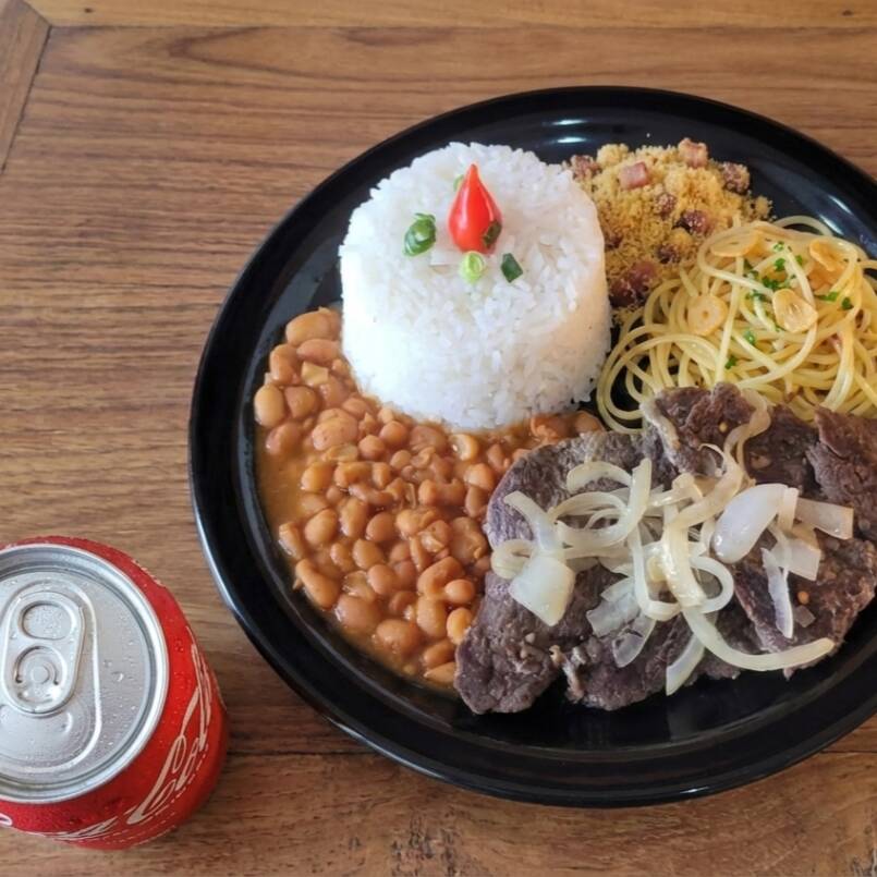 Bife acebolado grelhado e suculento, servido com arroz, feijão, macarrão alho e óleo e farofa. Uma refeição completa, saborosa e bem servida, com Coca-Cola grátis para acompanhar.
