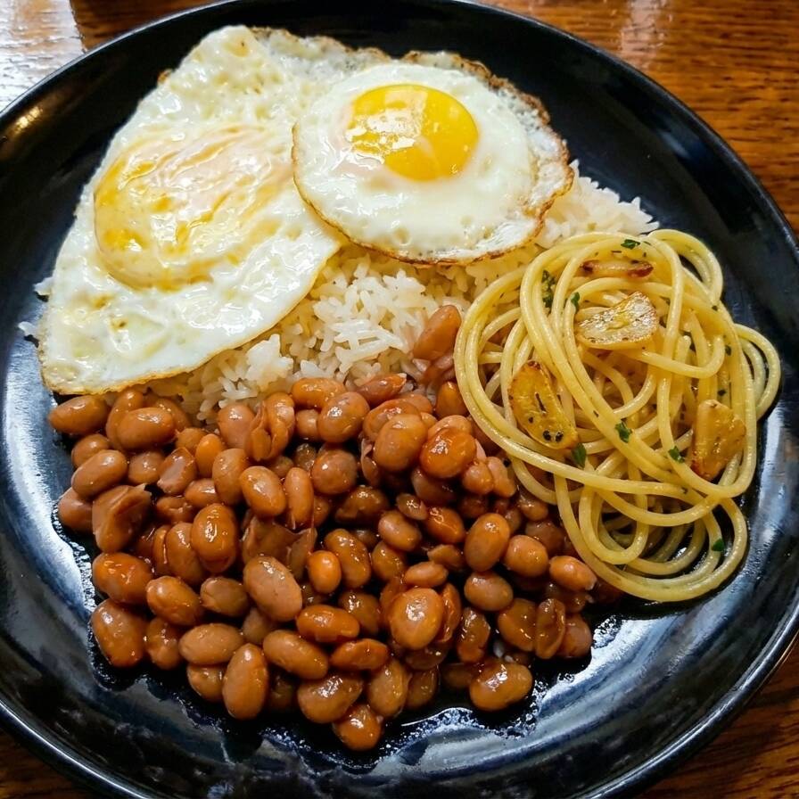 Dois ovos fritos na hora, com arroz soltinho, feijão saboroso, macarrão alho e óleo e farofa. Uma refeição simples, bem servida e com aquele gostinho caseiro irresistível.