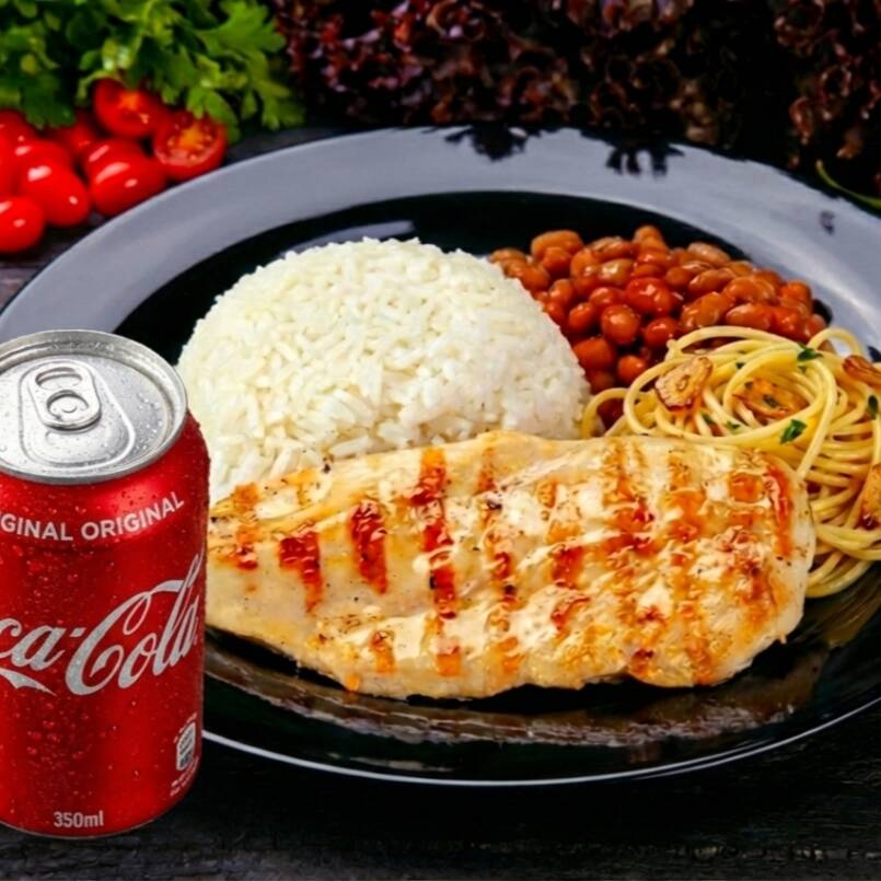 Filé de frango grelhado e temperado na medida certa, acompanhado de arroz, feijão, macarrão alho e óleo e farofa. Leve, equilibrado e completo — ainda com refrigerante 200ml grátis.