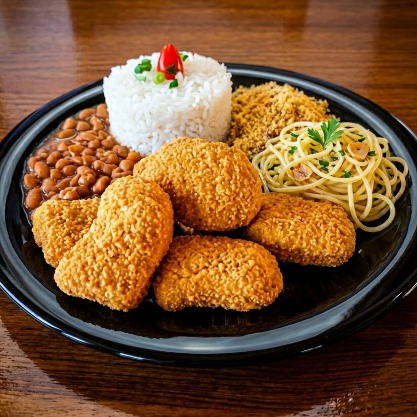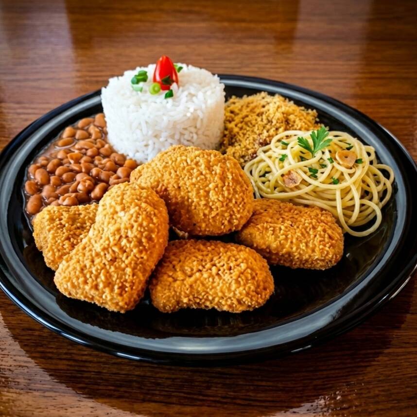 Nuggets de frango crocantes e suculentos, acompanhados de arroz, feijão, macarrão e farofa da casa.