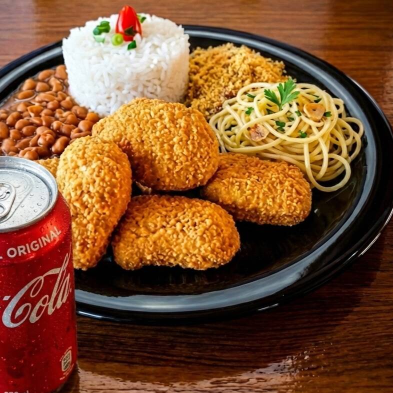 Nuggets crocantes e saborosos, acompanhados de arroz, feijão, macarrão alho e óleo e farofa. Uma refeição simples, completa e deliciosa — com Coca-Cola grátis.