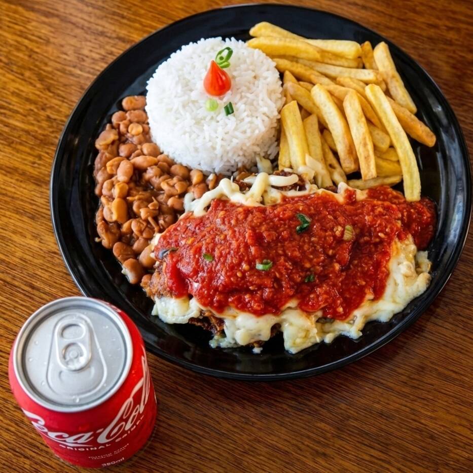 Parmegiana de carne suculenta, empanada e crocante, coberta com molho delicioso e queijo derretido, acompanhada de arroz soltinho e fritas. Uma refeição completa e irresistível!