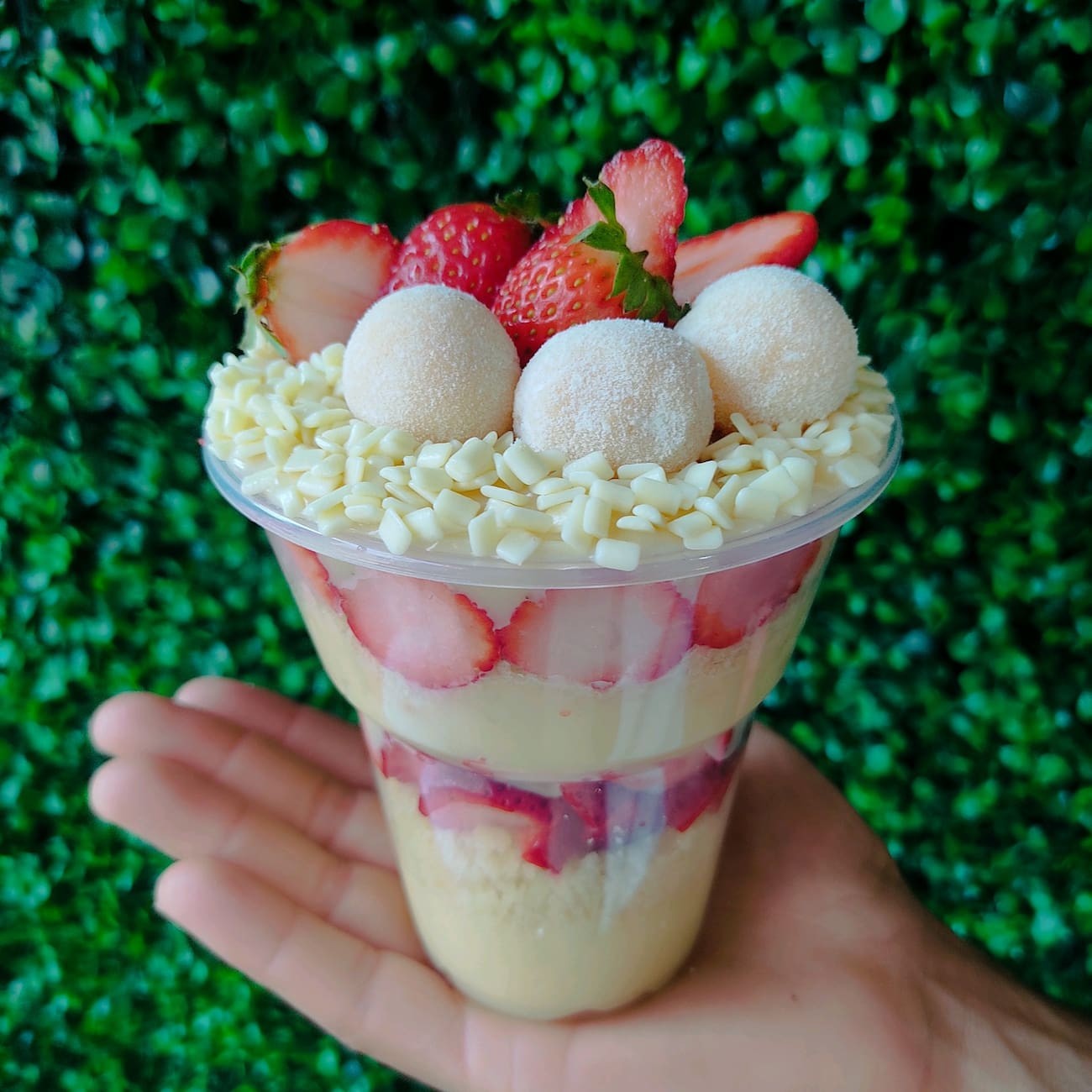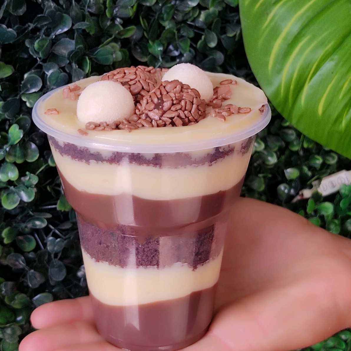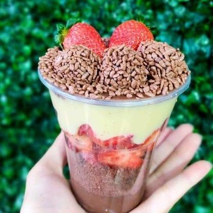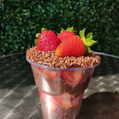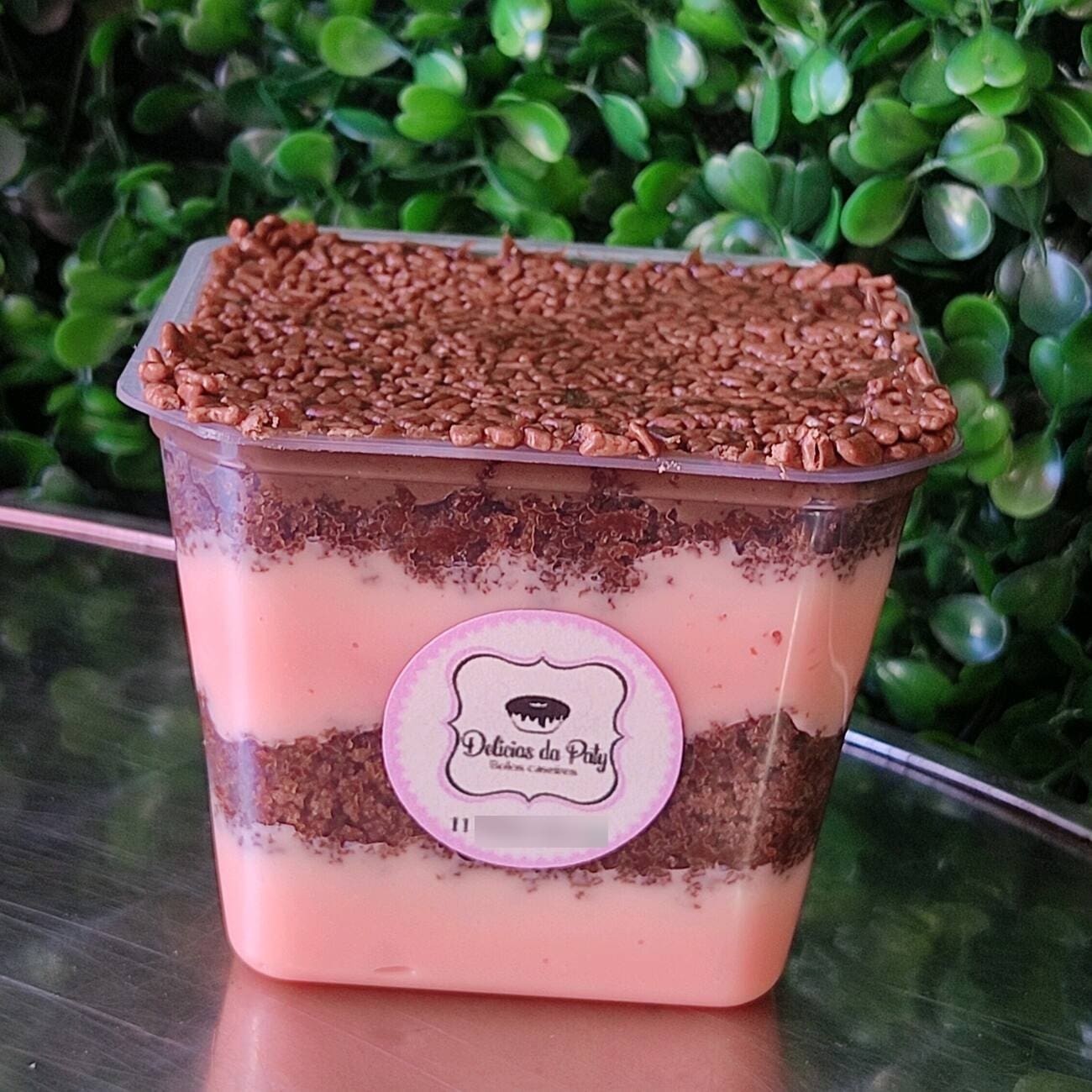 Maravilhoso copo contendo os melhores recheios,bolo de chocolate brigadeiro de chocolate gourmet,com morangos, brigadeiro de leite Ninho ,brigadeiros e morangos por cima !!! Aprox. 400 gramas de pura gostosura!!!