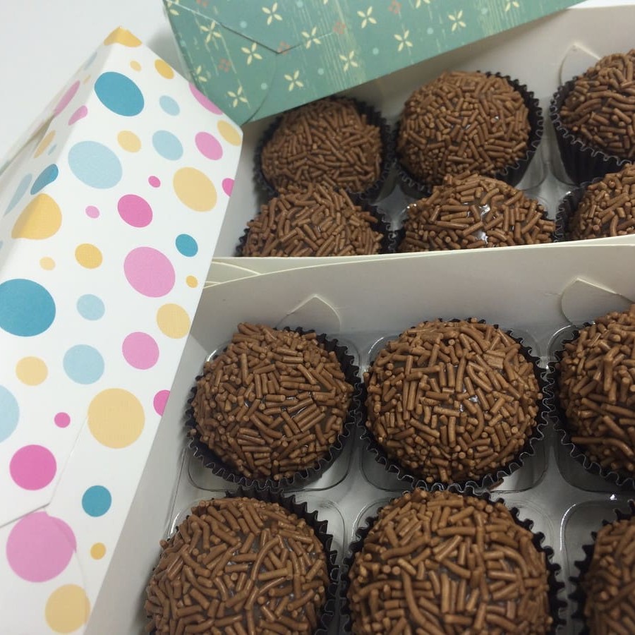 Brigadeiro tradicional a base de leite condensado,chocolate ao leite e chocolate granulado.