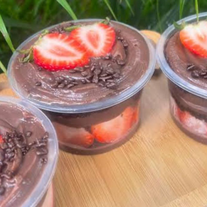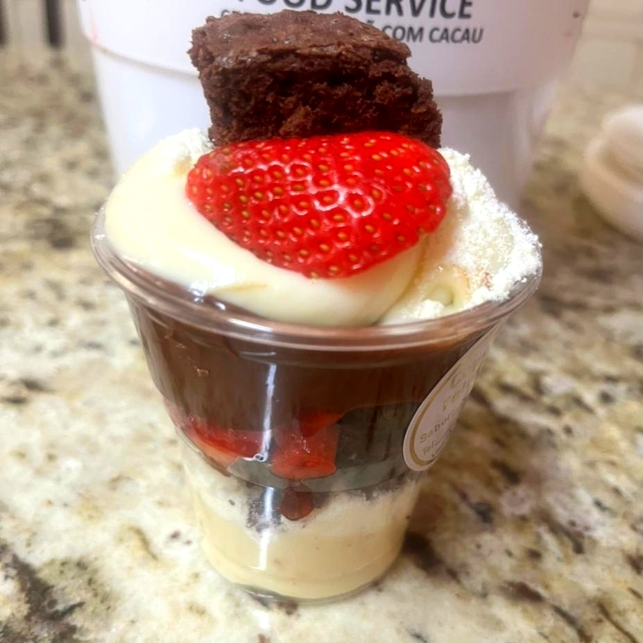 Uma explosão de sabores em cada camadinha! Camadas cremosas de brigadeiro de chocolate, pedaços suculentos de morango e pedacinhos generosos de brownie artesanal, finalizado com granulado crocante e um morango fresquinho no topo Perfeito para quem ama uma sobremesa bem chocolatuda e cheia de sabor Serve 1 pessoa (150ml)