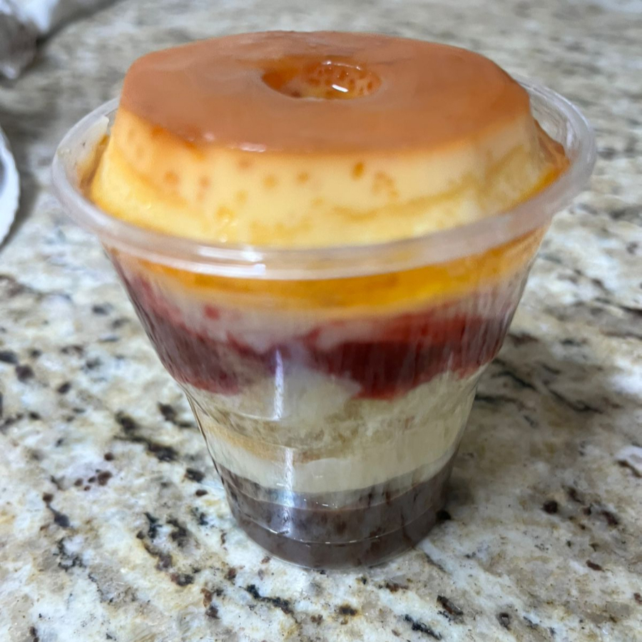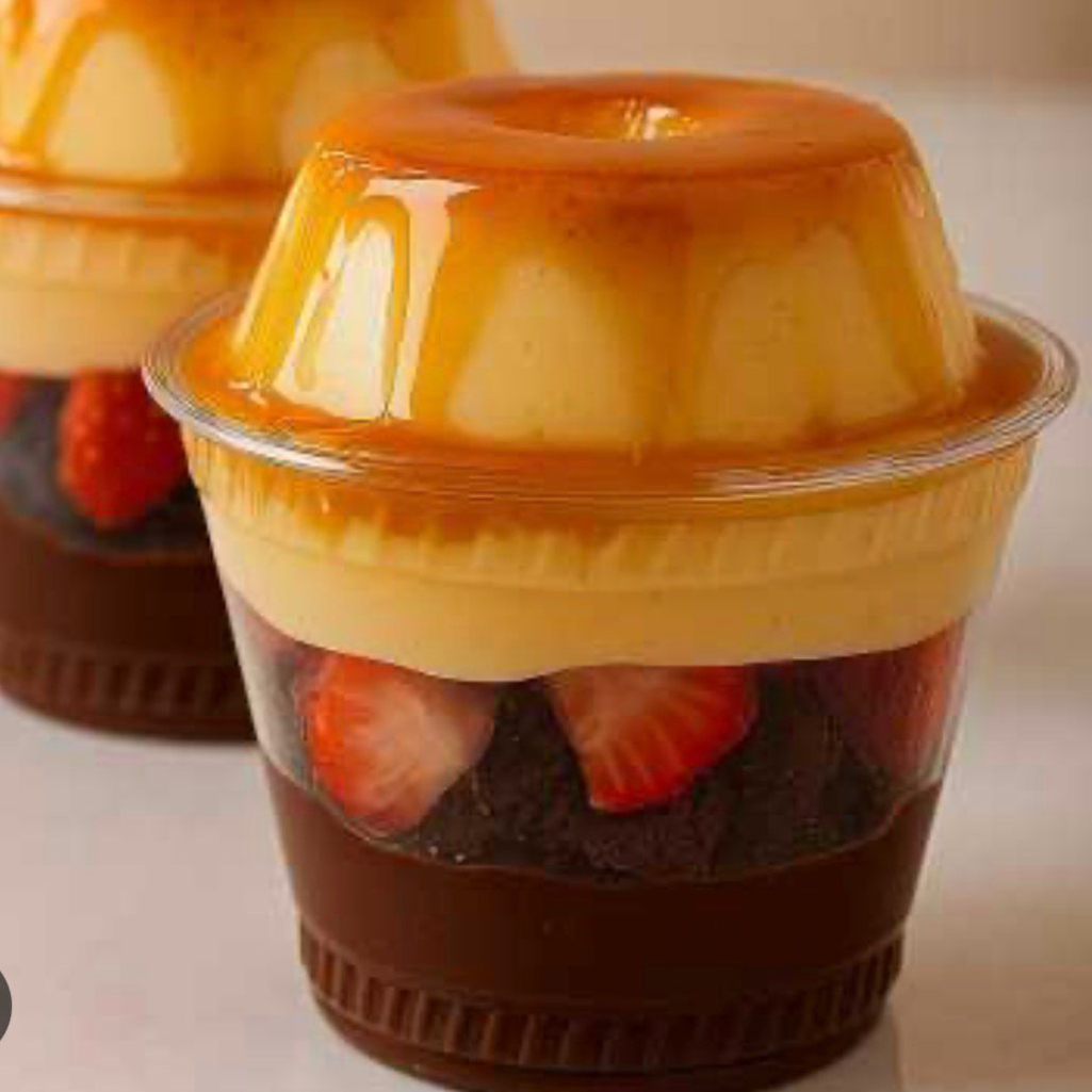 Uma sobremesa única e inesquecível! Camadas cremosas de brigadeiro, bolo fofinho, creme, geleia de morango caseira e o protagonista: um pudim inteiro no topo, macio e irresistível. Copo de 150ml