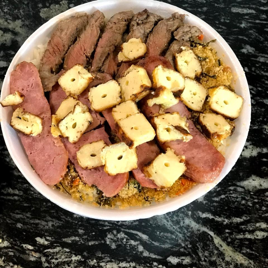 Arroz, feijão, Contra, Linguiça, Farofa e Queijo coalho
