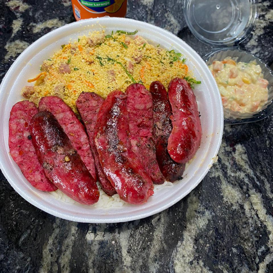 Para maiores Fome, Linguiça toscana, arroz feijão farofa e fritas, salada de maionese