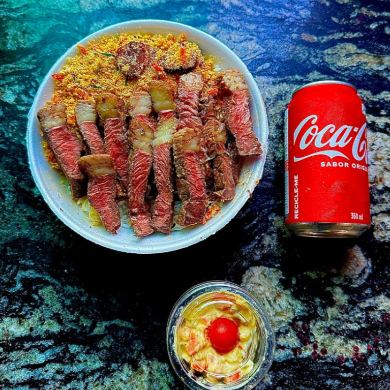 Picanha, Arroz, Feijão, Farofa, Fritas + Refri