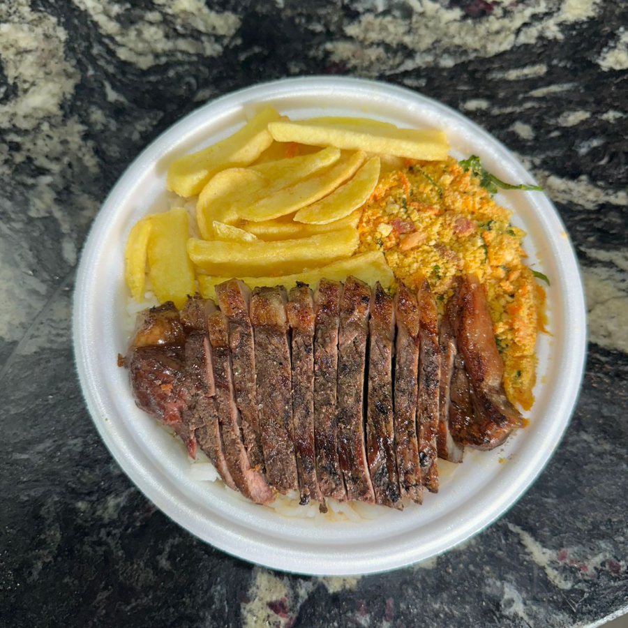 Contra filé Grelhado na churrasqueira, Arroz feijão, farofa caseira batata frita e salada .