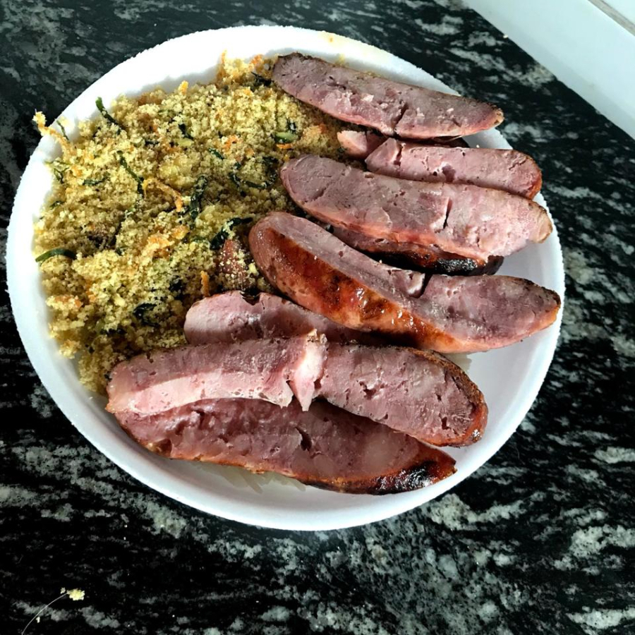 Linguiça toscana Grelhada, cortada em fatias, arroz feijão farofa caseira e fritas, e salada