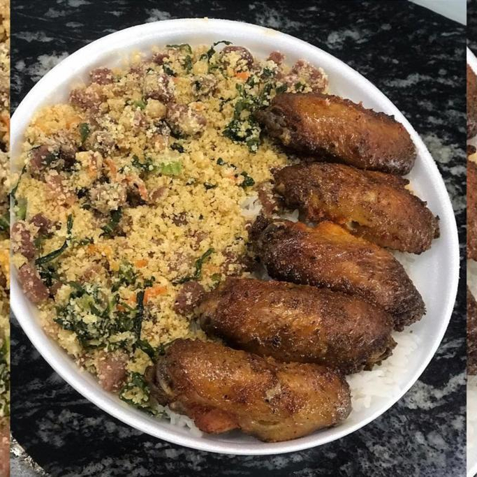 Refeição para maiores fome, Marmita média de 750ml Acompanha arroz feijão farofa fritas e salada