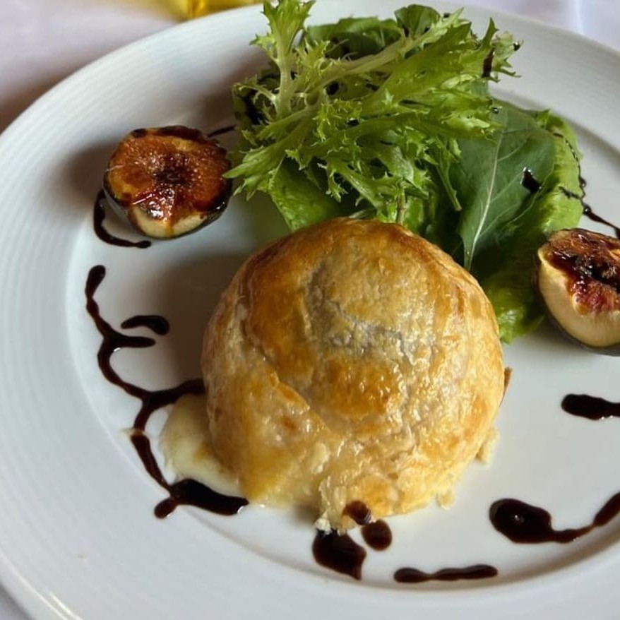Folhado crocante com queijo Camembert, geleia de figo e rúcula