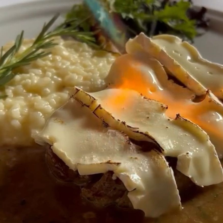 Medalhão de filé com queijo Brie maçaricado e risoto de Grana Padano