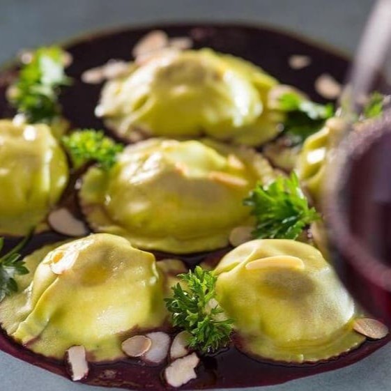 Ravioli de brie com geleia de figo fresco, redução de vinho do porto e especiarias laminado de amendoas
