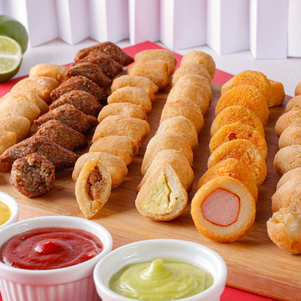 50 salgados mistos premium, crocantes por fora e recheados com sabores irresistíveis. Perfeitos para transformar qualquer momento em uma experiência especial! Aproximadamente 20 gramas cada
