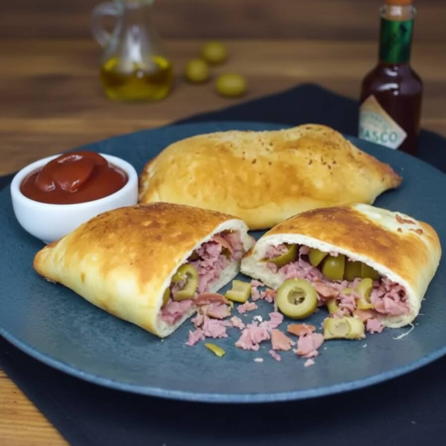 Presunto, Cebola, Maionese temperada, Mussarela, Queijo prato e Tomate. Serve 2 pessoas