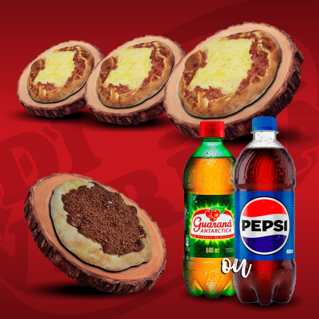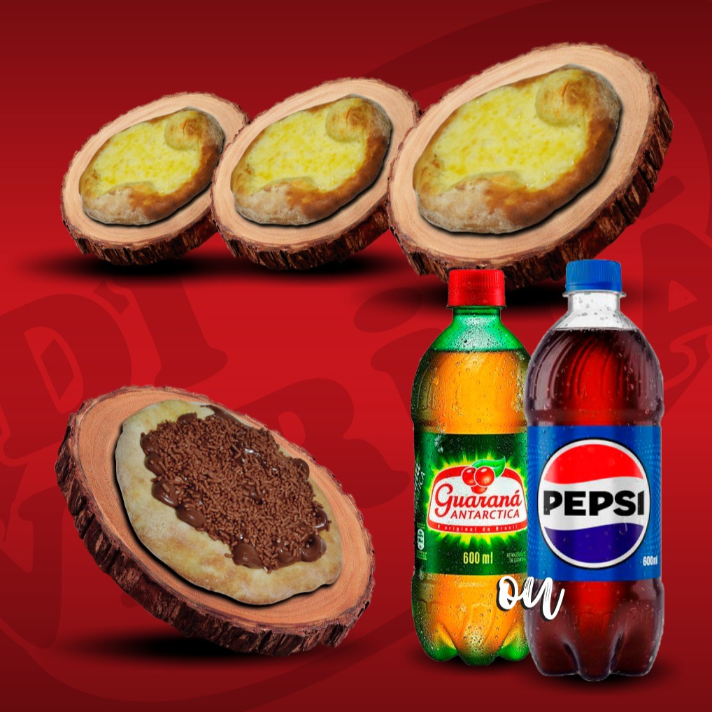 3 fogazzas de queijo, 1 fogazza de brigadeiro e 1 refrigerante 600ml
