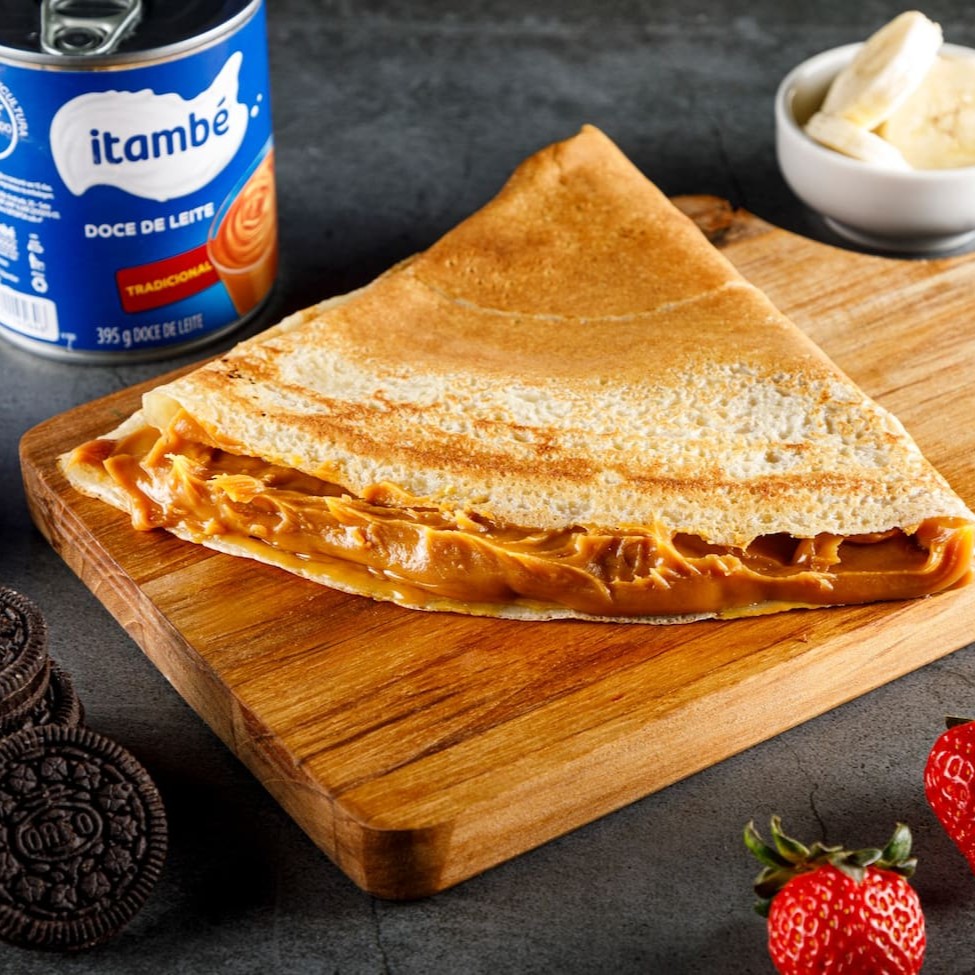 Crepe com massa fininha, recheado com um delicioso doce de leite cremoso.