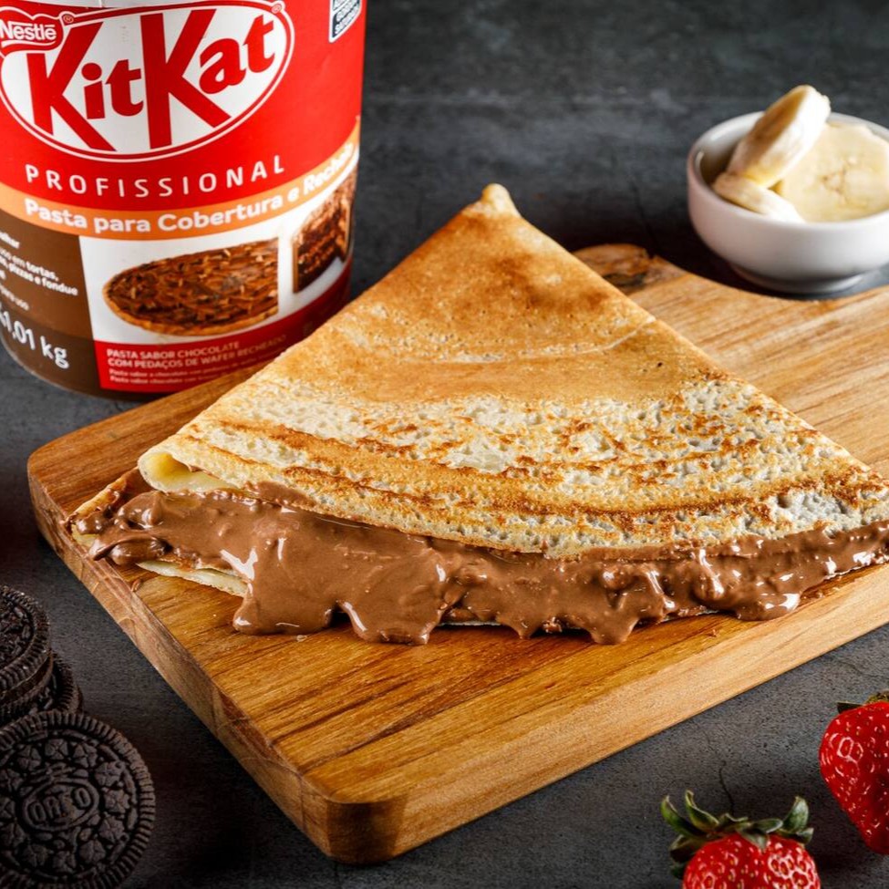 Crepe com massa fininha, recheado com chocolate cremoso Kit Kat (Original).
